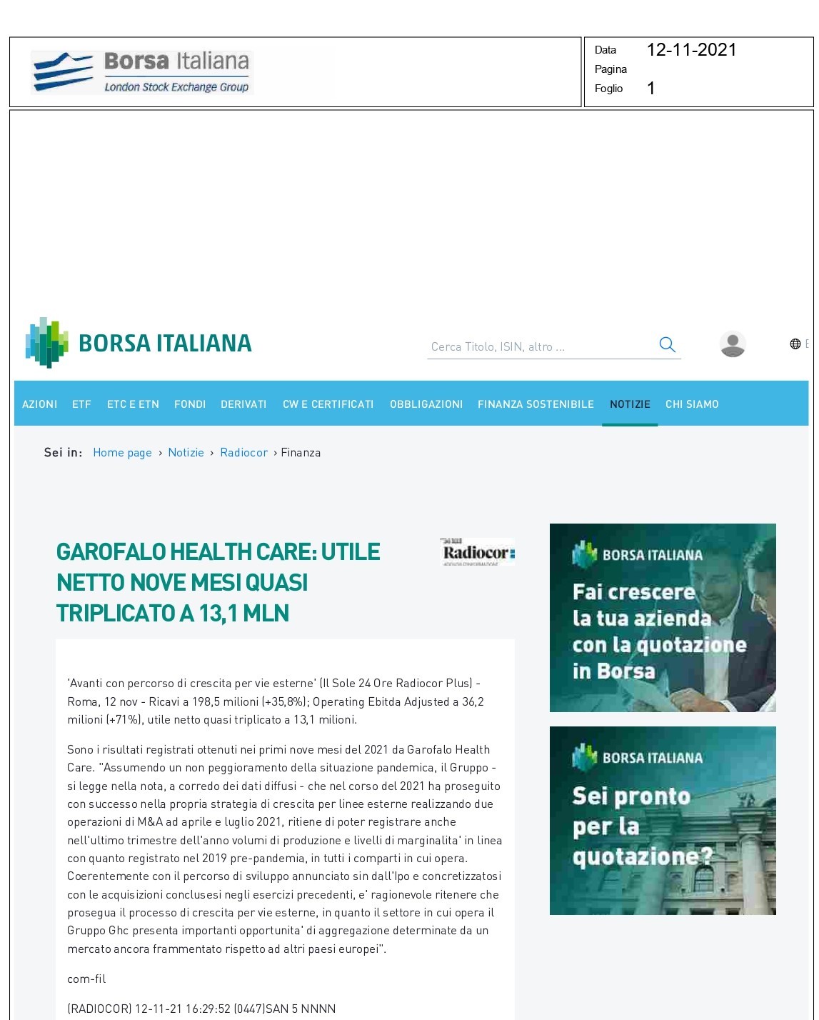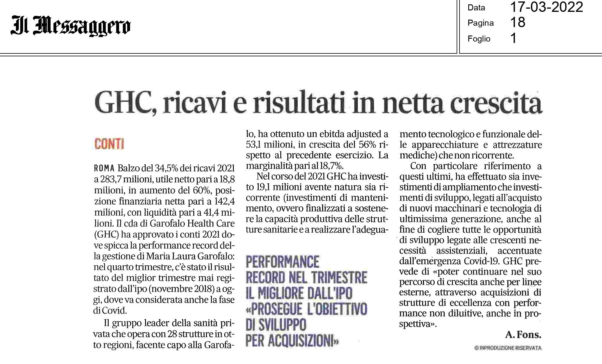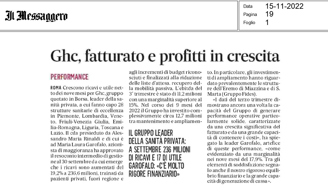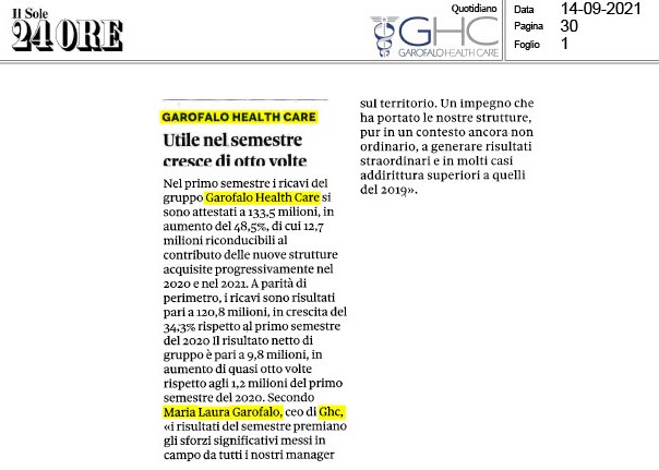 FINANZA.COM: "GHC: per Exane BNP Paribas ha ruolo strategico nel settore sanitario in Italia, titolo vale tra 6,6 e 7,4 euro"