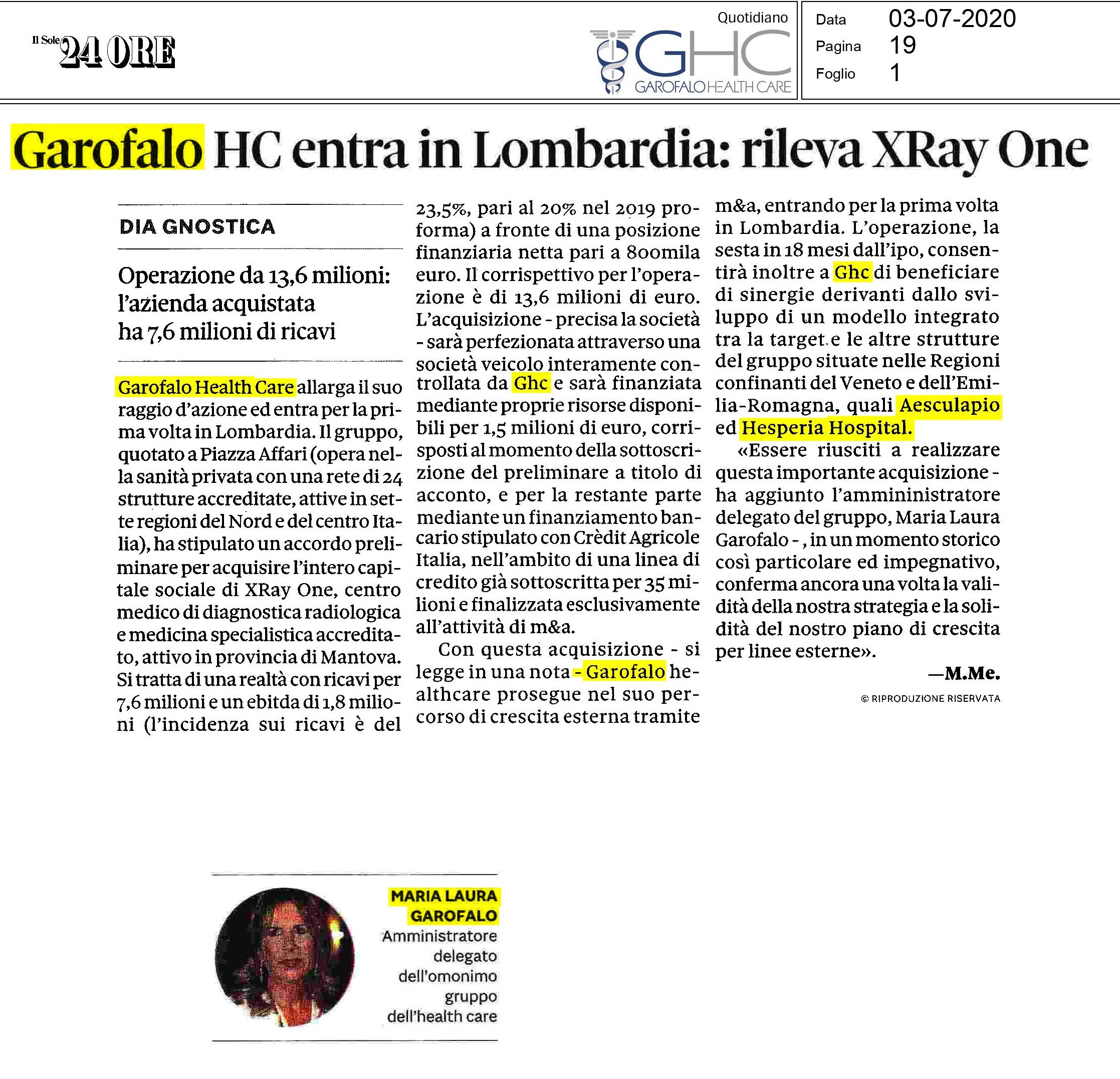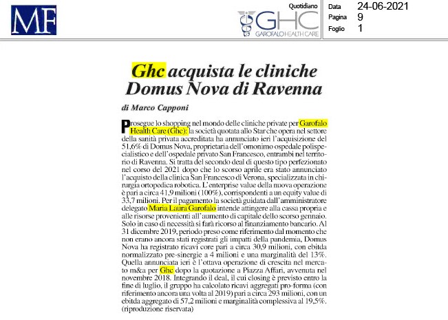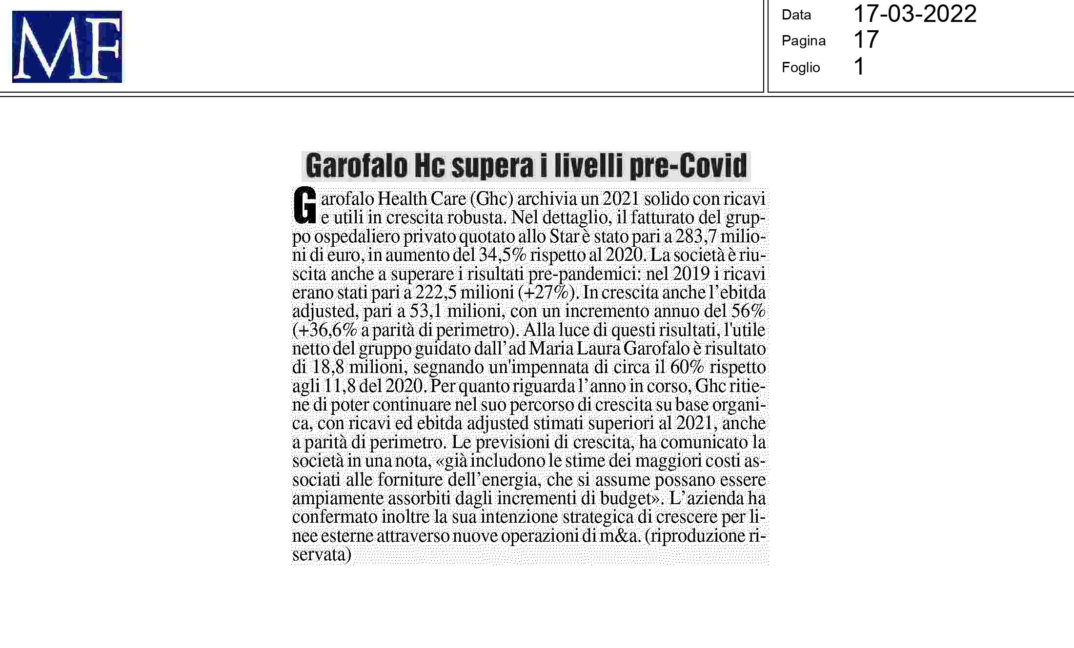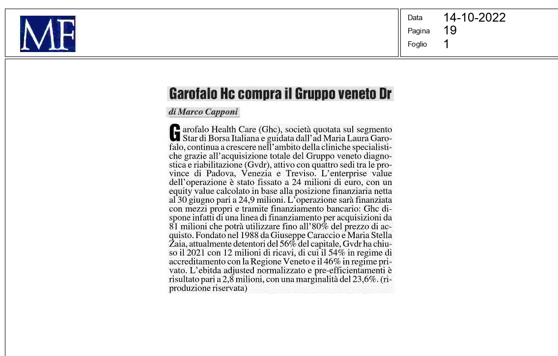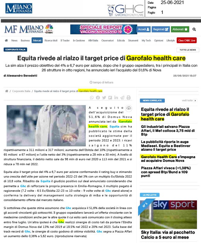 MILANOFINANZA.IT: "Equita rivede al rialzo il target price di Garofalo Health Care"