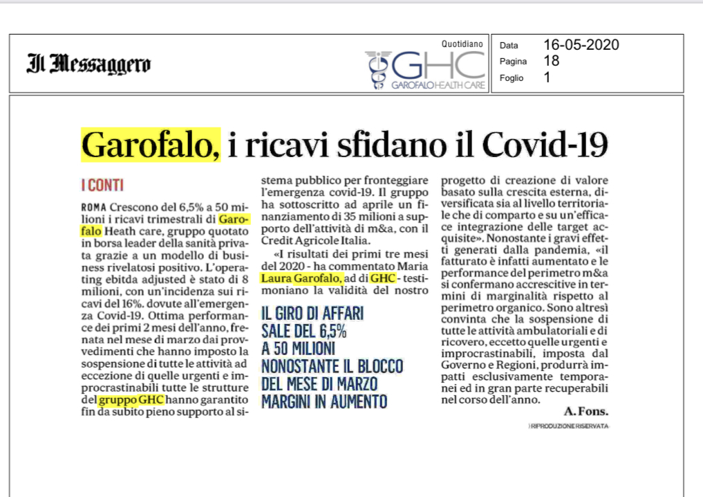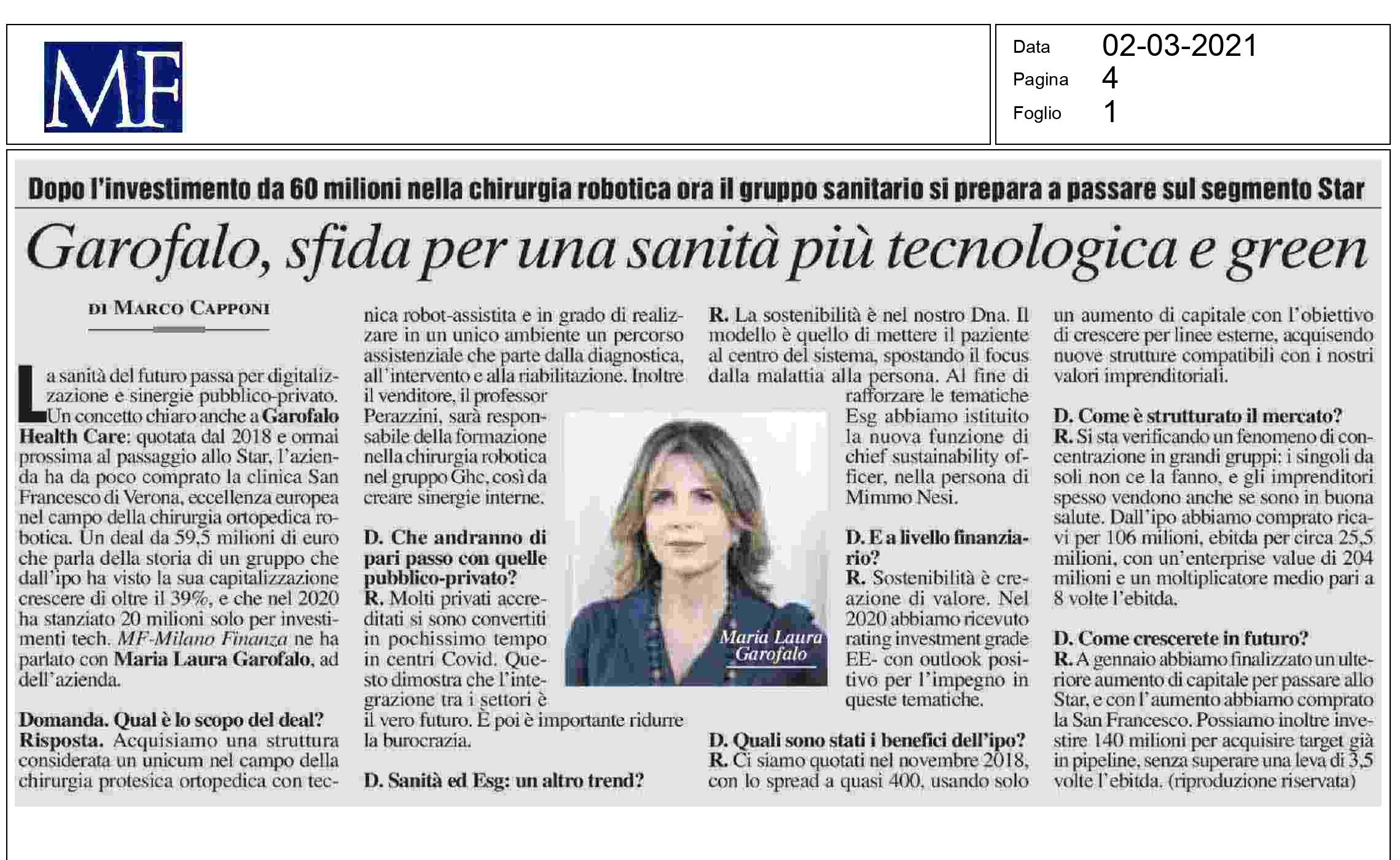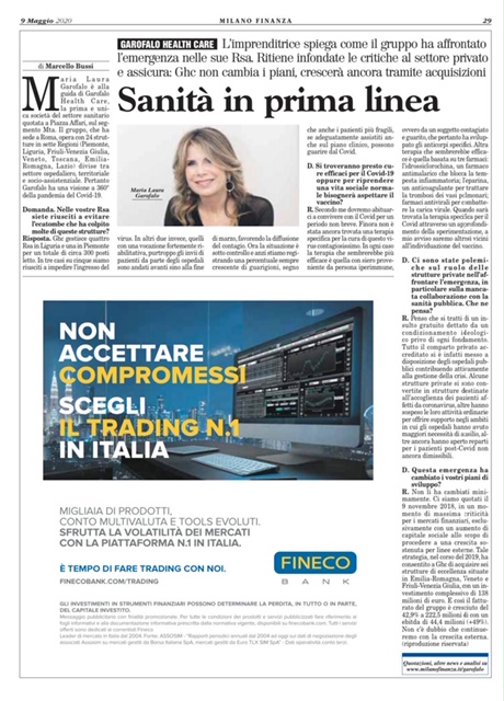 MF: "Sanità in prima linea. Maria Laura Garofalo spiega come il gruppo ha affrontato l'emergenza nelle sue RSA. Ritiene infondate le critiche al settore privato e assicura che il Gruppo crescerà ancora"