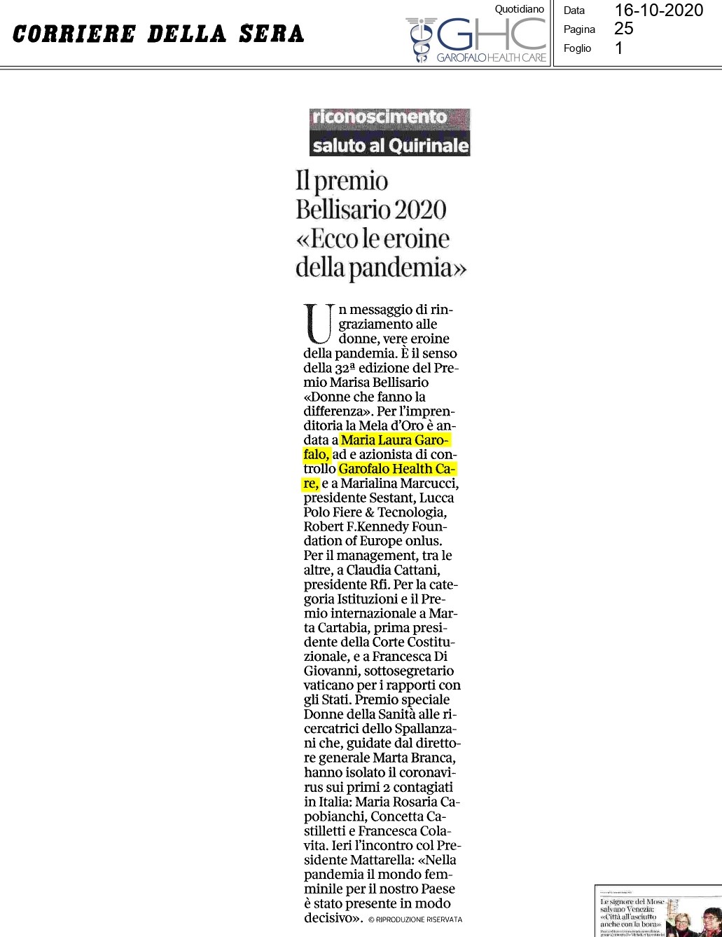 CORRIERE DELLA SERA: "Il Premio Bellisario 2020. Ecco le eroine della pandemia"