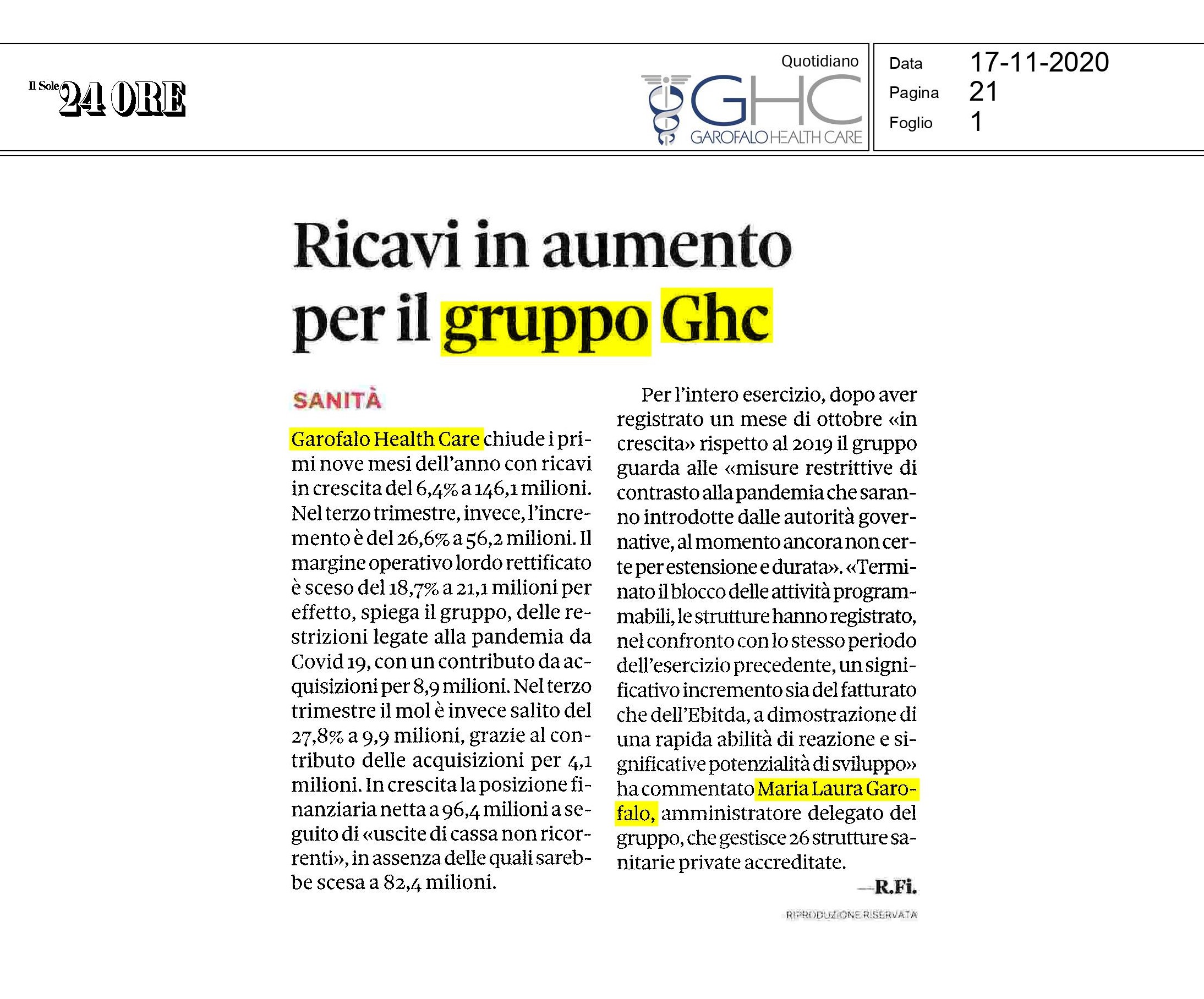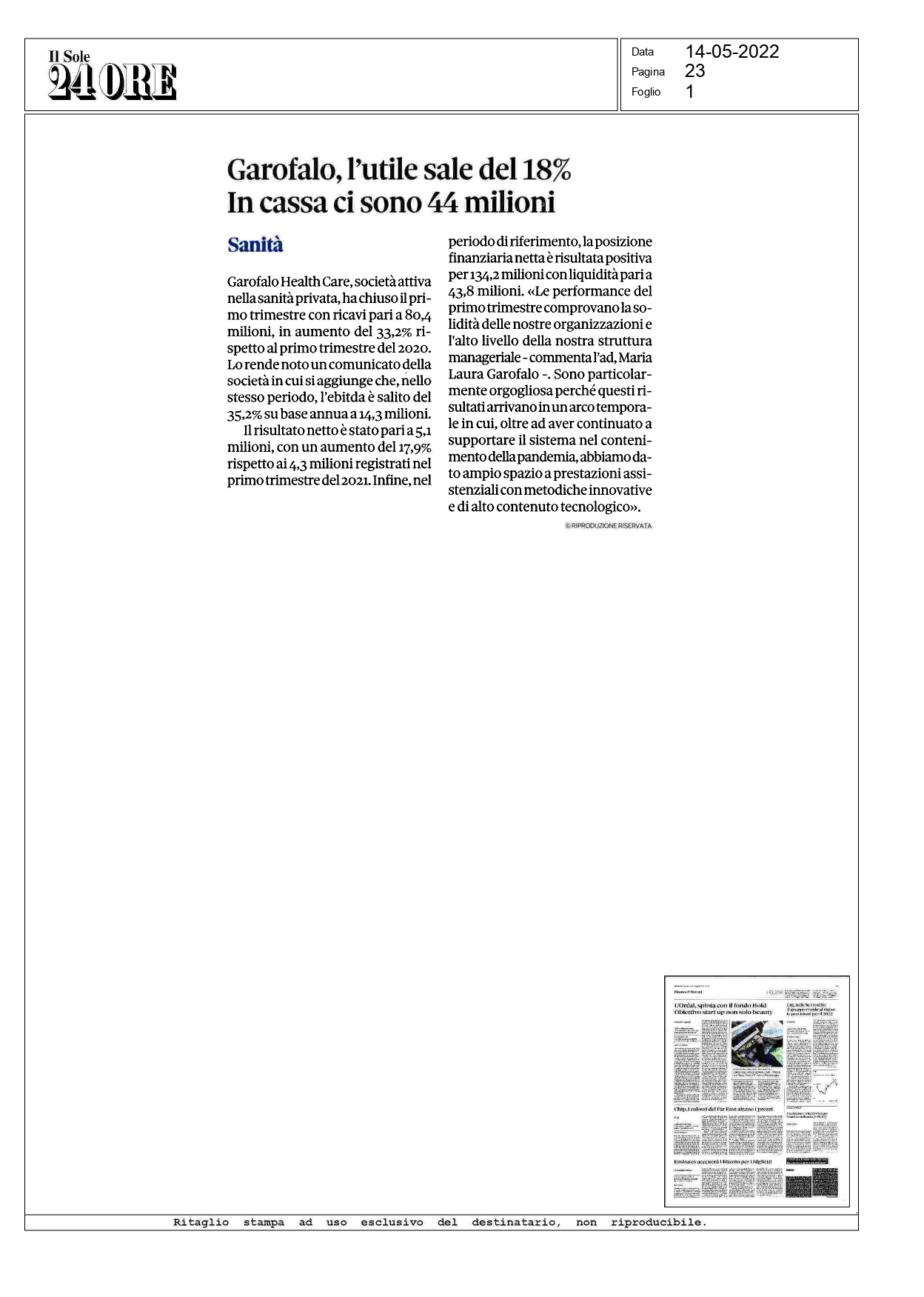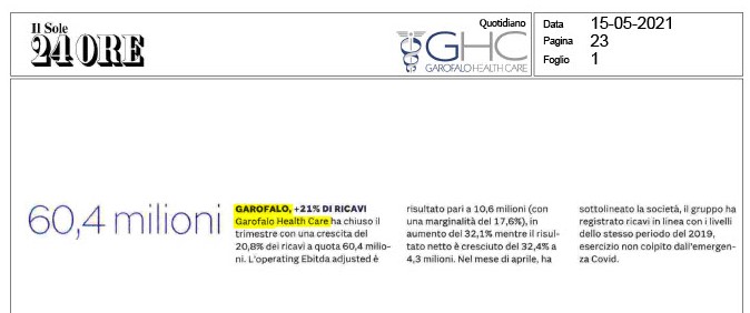 IL SOLE 24 ORE: Garofalo l'utile sale del 18%. In cassa ci sono 44 milioni