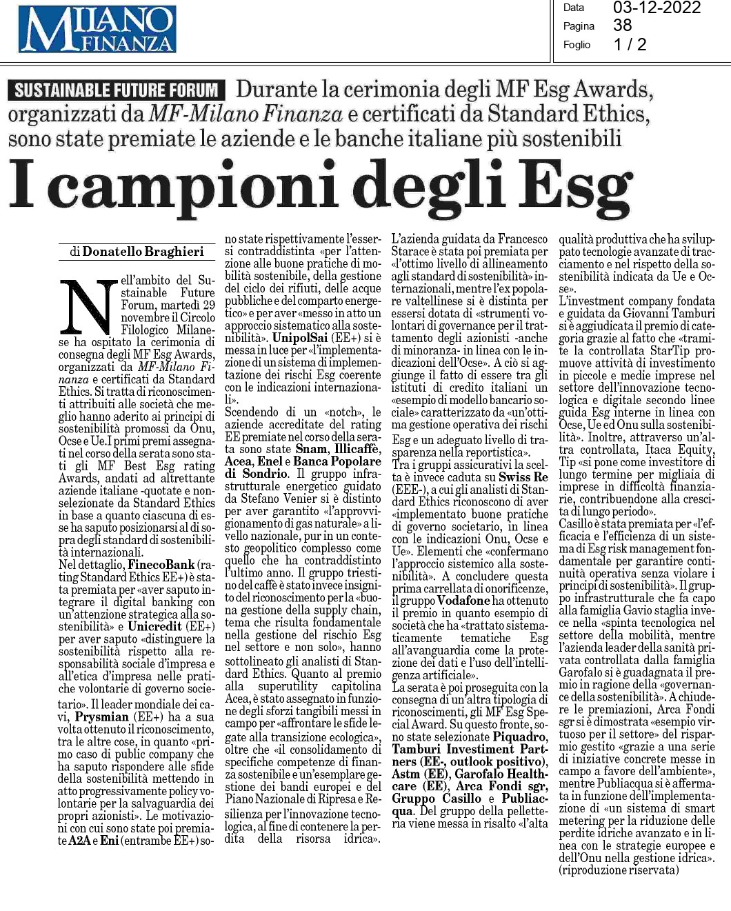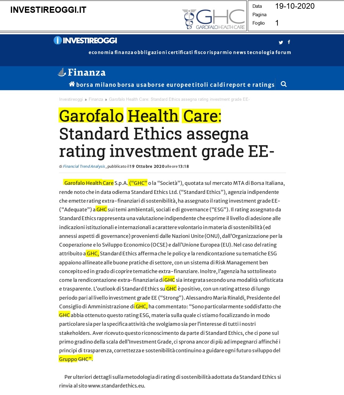 INVESTIREOGGI.IT: "Standard Ethics assegna rating investment grade EE a GHC su temi ESG"