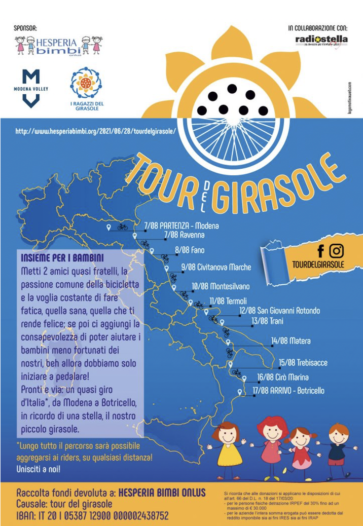 The Group’s activity is continuously accompanied by significant charitable initiatives with a high social content with the aim of protecting the health of poor children suffering from serious diseases. Among these initiatives, of particular importance is the project "Hesperia Children Onlus", which since 2016 aims to assist children and families of different nationalities, suffering from congenital or acquired diseases. Among the initiatives planned the TOUR OF THE SUNFLOWER intended to aggregate sports or simply bike lovers, for a fundraising in support of the care offered by Hesperia Children Onlus.