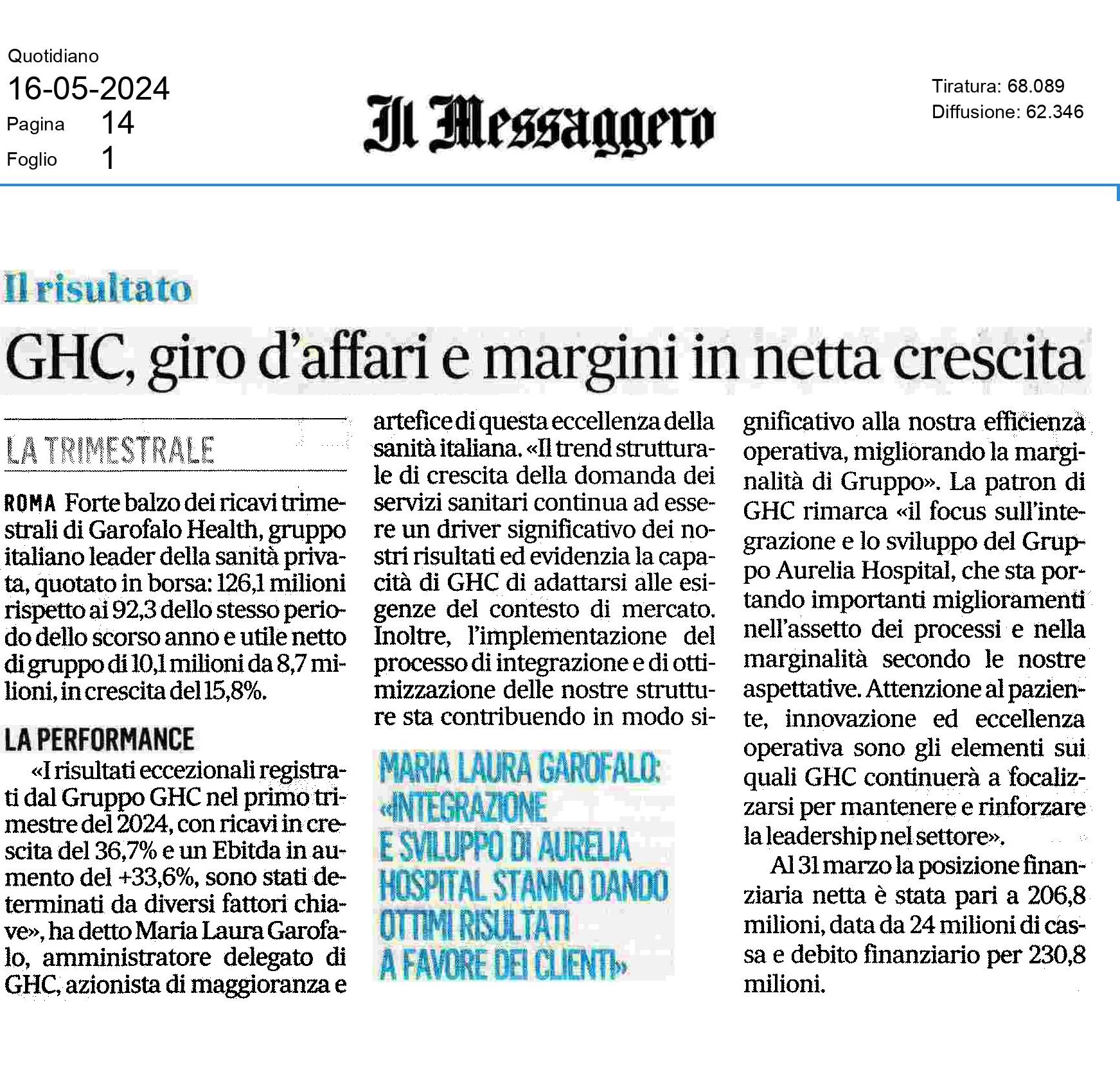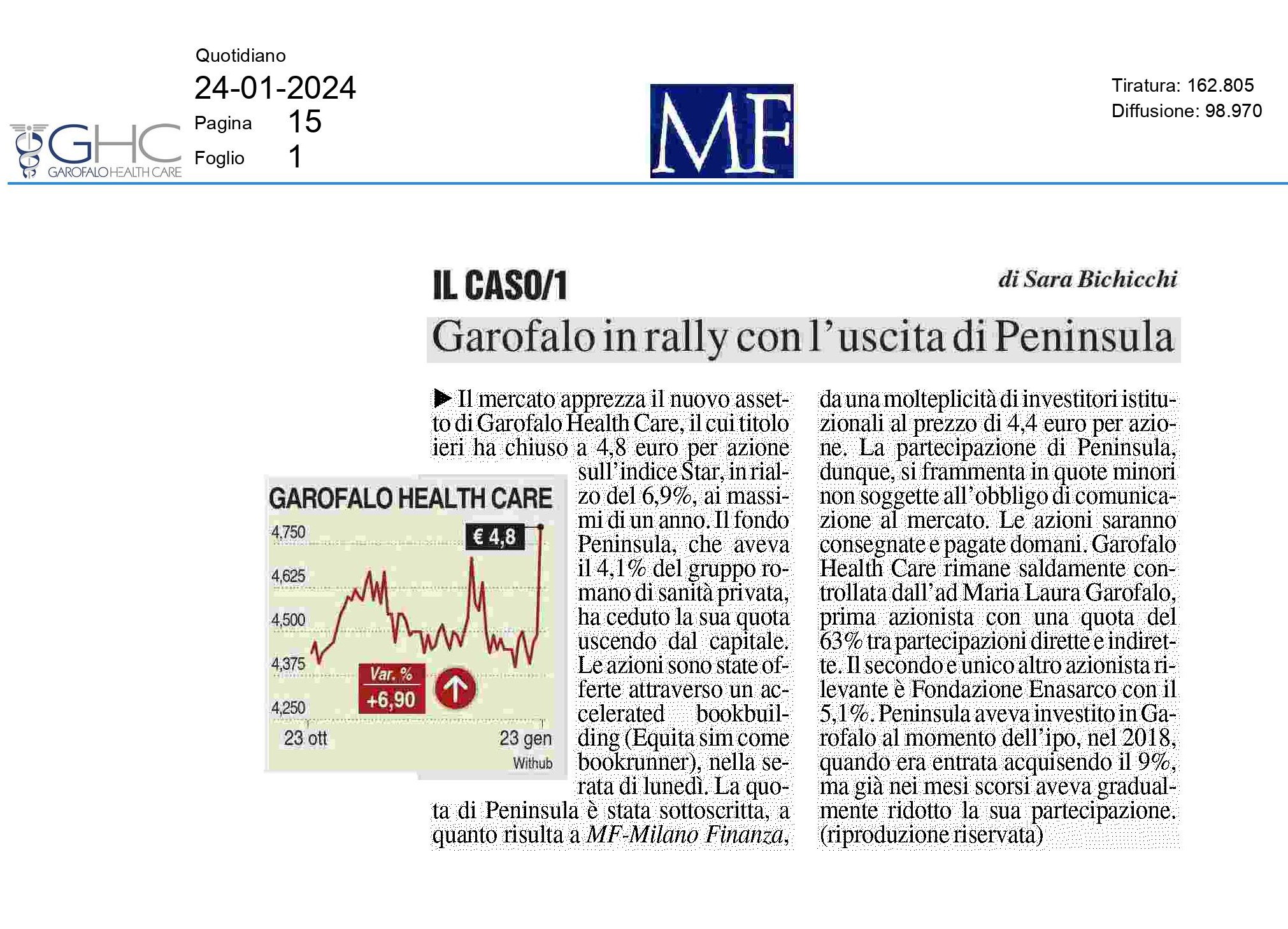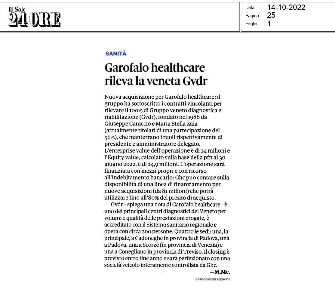 IL SOLE 24 ORE: Garofalo Health Care, i ricavi salgono a 251 milioni (+35%)