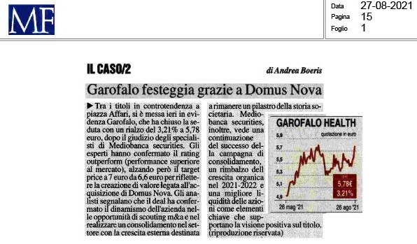 MILANOFINANZA.IT: "Equita rivede al rialzo il target price di Garofalo Health Care"